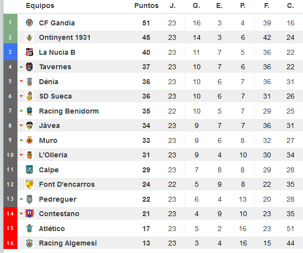 El resto de la jornada, destaca la derrota de Ontinyent en el campo de su inmediato perseguidor, La Nucia, que se sitúa a 5 puntos de esa codiciada segunda plaza para la promoción de ascenso. La pelea en la zona de descenso se amplia y ya implica a la Font d’Encarros, que ocupa el puesto 12, tras su derrota frente al Pedreger que sale de esa zona y el empate del Contestano frente al líder.