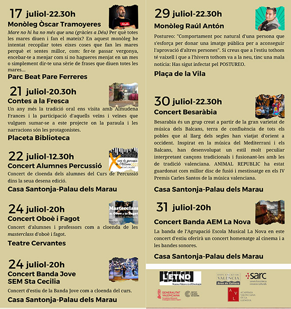 Vuelve un año más las «Nits d’estiu» para amenizar las noches del mes de julio. Este año cabe destacar la diversidad de escenarios que acogeran las diferentes actuaciones, el Parc de la Riba, el Parc Beat Pare Ferreres, la placeta de la Biblioteca, los teatros Cervantes y Goya, la plaza de la Vila y por supuesto la Casa Santonja.