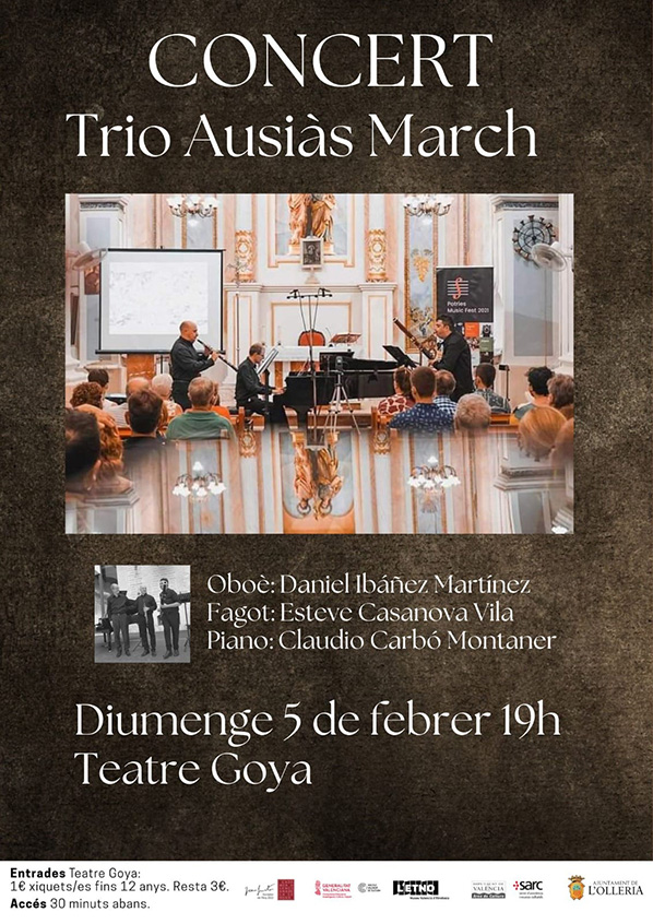 El “Trio Ausiàs March” format per Daniel Ibáñez Martínez a l’oboè, Esteve Casanova Vila al fagot i Claudio Carbó Montaner al piano, porta des de 2019 fent música junts i està fent una gran tasca en ampliar la música espanyola i internacional i en expandir el repertori compost per a aquesta formació mitjançant encàrrecs a diferents compositors espanyols i Internacionals amb diversos i molt variats llenguatges i estils compositius. Han publicat un article molt especial, a la revista anual d’AFOES (Associació d’Oboistes i Fagotistes d’Espanya), on es parla de la gran feina d’ampliació del repertori per a aquesta formació, que realitza el “Trio Ausiàs March”. Els músics d’aquest grup s’han format en institucions com el Txaikovsky Conservatory de Moscou, la Hochschule für Musik de Freiburg (Alemanya), l’Escola Superior de Música “Reina Sofia” de Madrid, el Conservatori Superior de Música “Joaquín Rodrigo” de València o el Centre Superior de Música del País BascMusikene. Entre els seus projectes hi ha l’enregistrament del seu primer disc per al segell IBS CLASSICAL, al pròxim febrer de 2023, a l’Auditori “Manuel de Falla” de Granada, o una gira per Llatinoamèrica, per països com Hondures i Costa Rica. També, han sigut premiats al concurs, de caràcter internacional, celebrat a Viena “BTHVN”, amb la “Menció Especial”, en la modalitat de música de cambra i en la categoria professional, així com el “Premi de Bronze” al concurs internacional “Amadeus” de Salzburg (Austria).