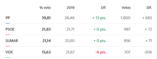 El Partido Socialista con 987 votos y la formación Sumar con 956 votos, registran un aumento de 72 y 71 votantes respecto a los comicios anteriores.