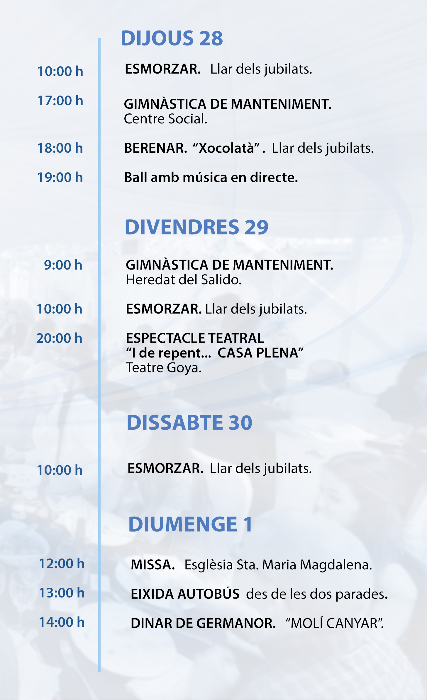Gimnàstica de manteniment, esmorzars i berenars, tallers de risoteràpia, ball i espectacles musicals es duran a terme entre altres activitats al llarg dels dies, totes elles dirigides als i les nostres majors. La setmana finalitzarà el diumenge, 1 d’octubre, amb el Dinar de Germanor.
