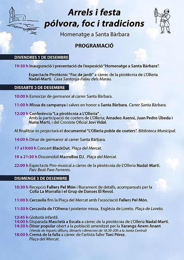 De hecho, aunque no es una tradición propia de L’Olleria, podremos disfrutar de una «falla». “Arrels i festa: pólvora, foc i tradicions”, el II Congrés de Pirotècnia y las Fallas 2023. Ayer fue la ‘plantà’ del monumento fallero a cargo del artista Toni Pérez, situado en la plaza del Mercado y que se quemará el próximo domingo, 3 de diciembre, a partir de las 18 horas.