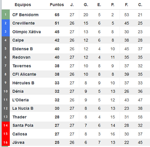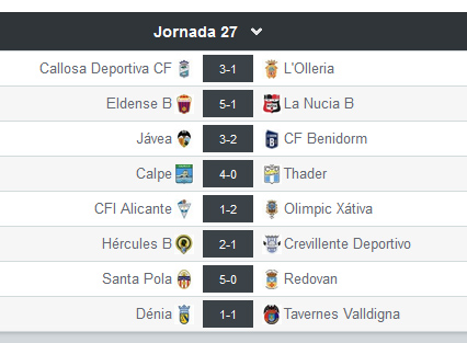 Y es que esta última jornada la rebelión del descenso nos ofreció resultados imprevisibles. El Callosa ganó a L’Olleria, el Santa Pola arrasó al Redovan (próximo rival de L’Olleria), y el Jávea derrotó al lider. Del resto de la mitad baja de la tabla, tan sólo el Hércules B aprovechó la ocasión de poner tierra por el medio venciendo al Crevillente. Estos resultados ahora mismo, convierten en candidatos al descenso a los 8 equipos de la parte baja de la clasificación.