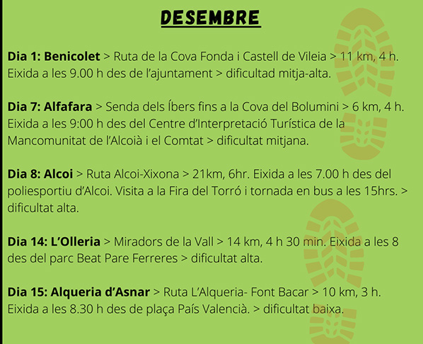 Dia X: Municipi on es fa la ruta > ruta a realitzar > total km anada i tornada, duració aproximada > grau de dificultat. (Hora i lloc d’eixida).