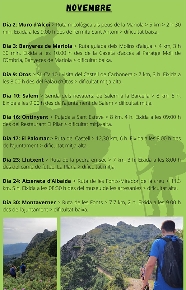 La Mancomunitat de la Vall d’Albaida (provincia de Valencia) y l’Alcoià i el Comtat (provincia de Alicante) lanzan, un año más, una nueva edición de las rutas guiadas de senderismo GRATUITAS con la actividad Senderisme Entre Muntanyes 2024.