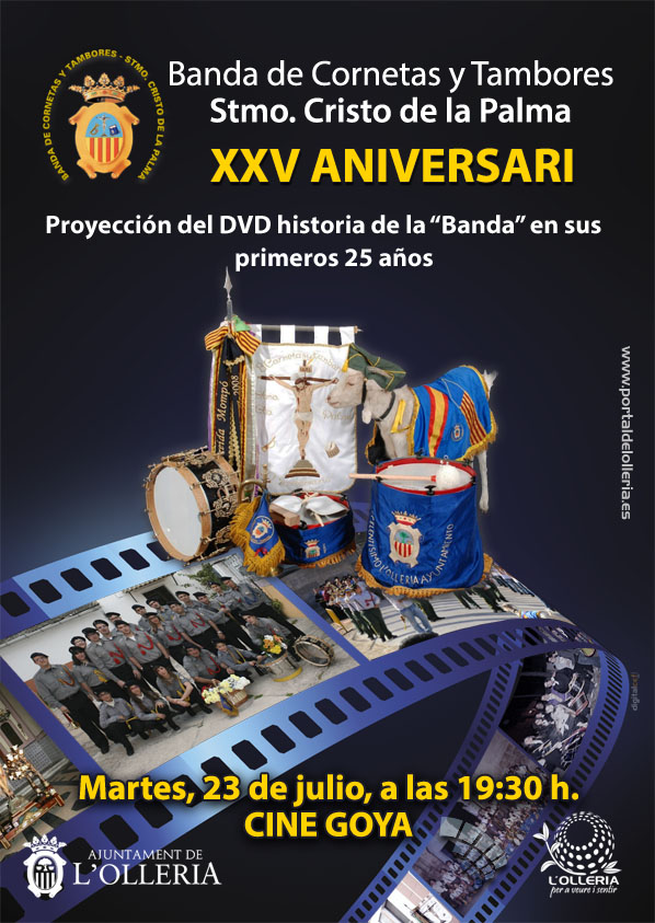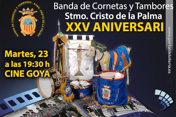 La Banda de Cornetas y Tambores Stmo. Cristo de la Palma, con motivo de su XXV Aniversario, proyectará un DVD recopilatorio de la historia de la banda. Un repaso en videos e imagenes desde los inicios hasta lo que hoy en día es esta prestigiosa banda. El pase se realizará el martes 23 de Julio en el Cine Goya a partir de las 19:30 h.