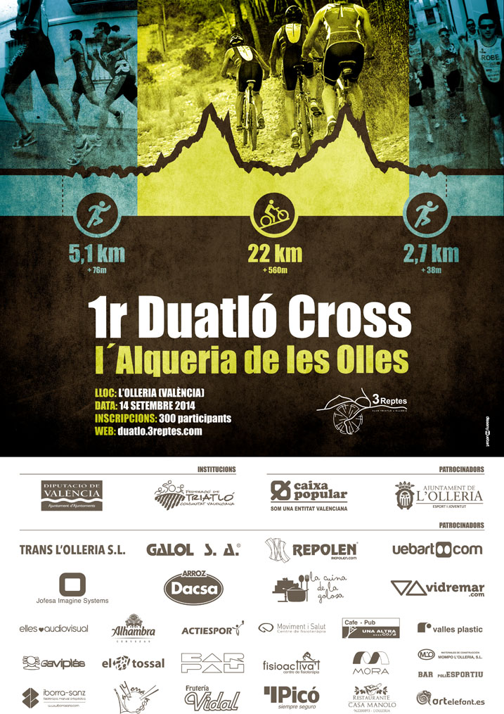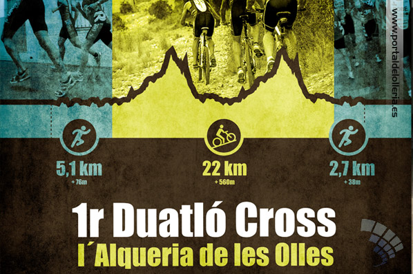 el I DUATLÓN CROSS LA ALQUERIA DE LAS OLLAS. Hemos diseñado la prueba con mucho cuidado y cariño, intentando que todo el protagonismo sea del participante, y al mismo tiempo, aprovechando esta ocasión para mostrarle los rincones más bonitos y más históricos de Olleria.En definitiva, para mostraros un trocito de nuestra historia. Aquí tenéis los detalles de la prueba:Entrega de dorsales el día 13/09 de 18:00 a 20:00 horas, en la Casa Santonja (Museo del vidrio, calle Ravalet – L’Olleria).