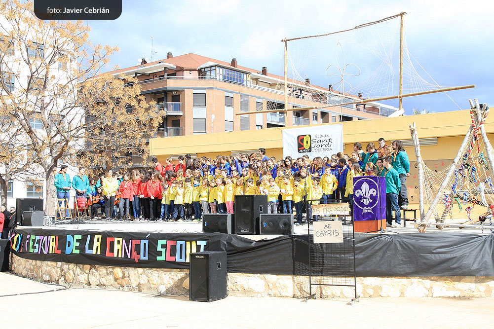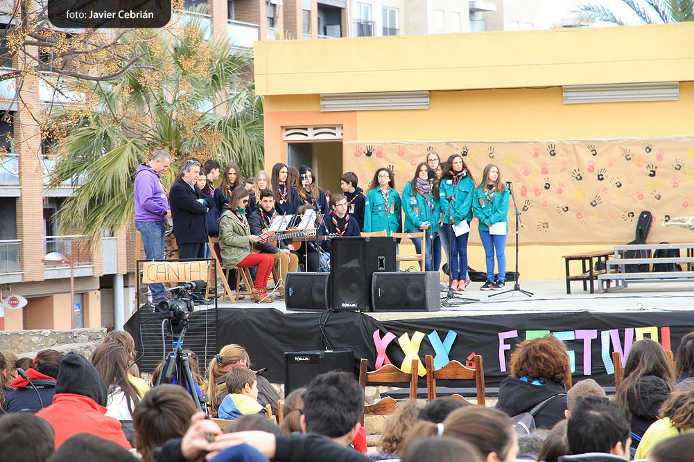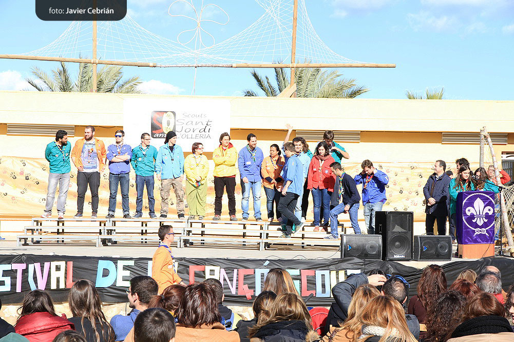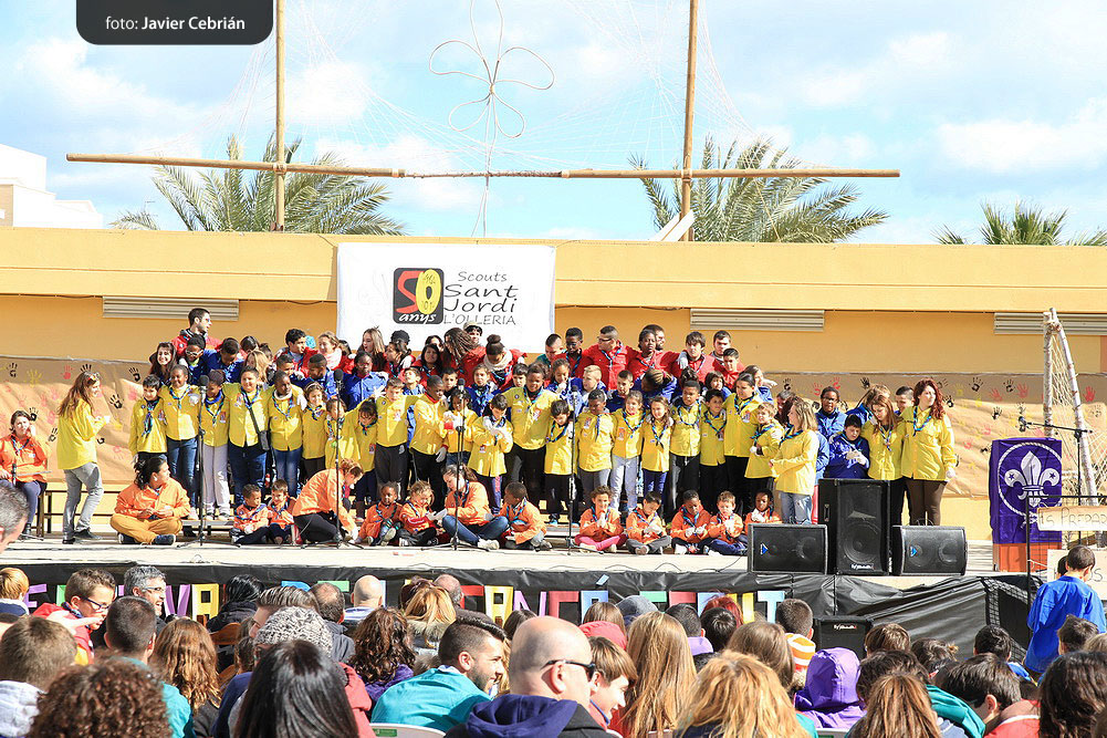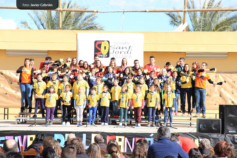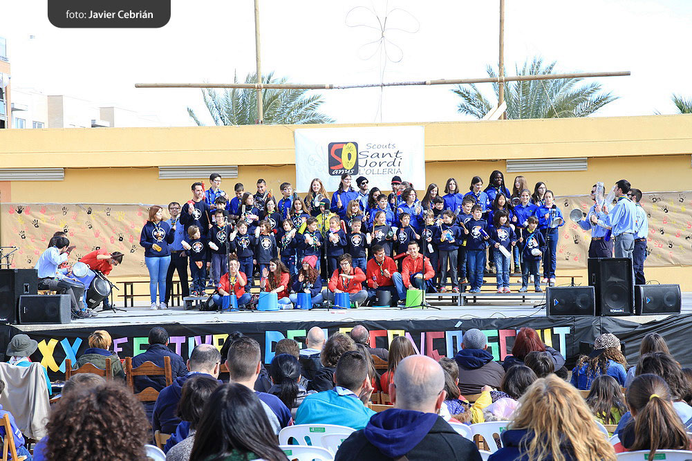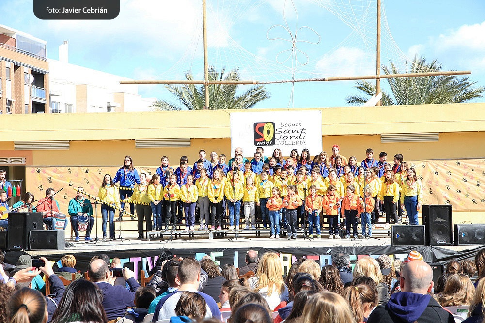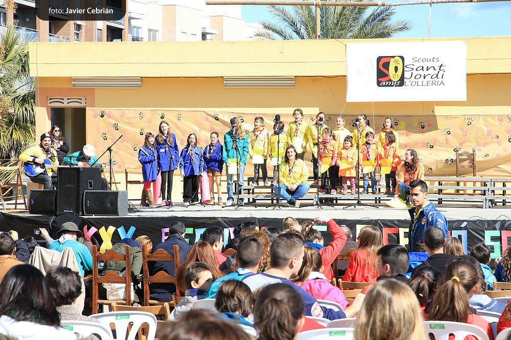Estos fueron los acordes en los que cerraron el Grupo Scout Sant Jordi el XXX Festival de la Canción Scout celebrado en el Parque Beat Ferreres de l’Olleria, el pasado domingo 22 de febrero. Más de 2500 scouts venidos de todos los rincones de la provincia de Valencia y los que se quedaron en casa podían seguir el festival por el canal de Internet You Tube, gozaron este domingo de una de sus actividades más importantes del año a nivel asociativo, fueron 26 canciones llenas de sentimientos, escultismo, solidaridad, naturaleza… que hicieron que nuestro pueblo se llenara de notas musicales, un sin fin de notas de guitarra, ritmos de los bongós, voces celestiales de niños y niñas que consiguieron con sus canciones que las nubes y el frío de la mañana diera paso al flamante sol, un sol que nos acompañó buena parte de la mañana y que no se quiso perder ninguna de las actuaciones.