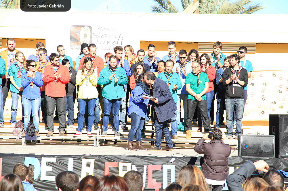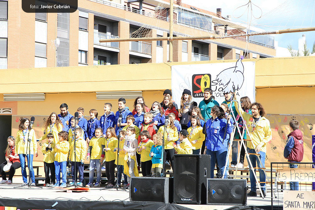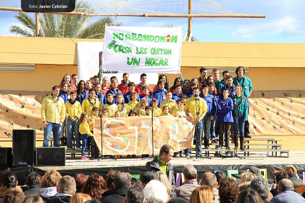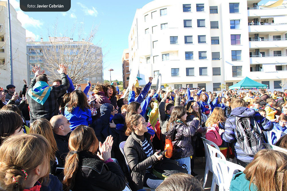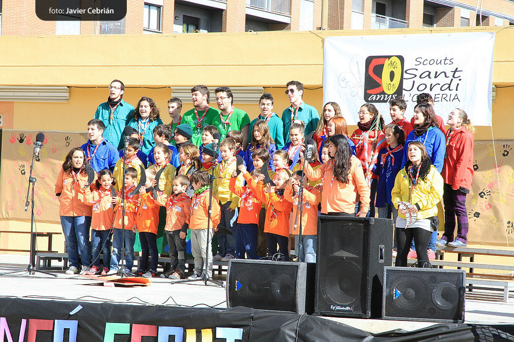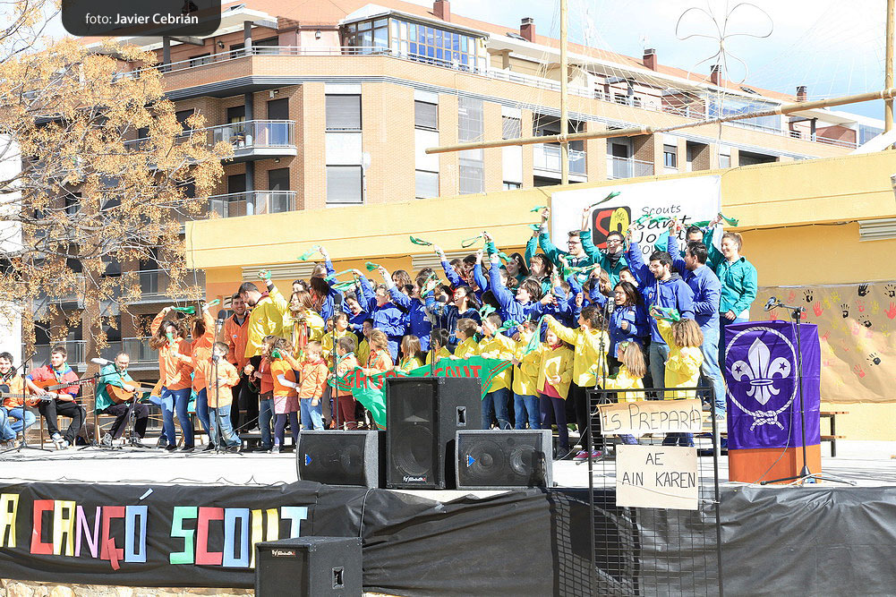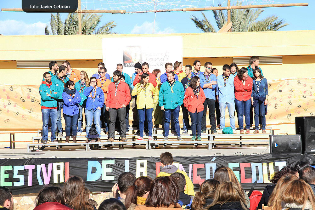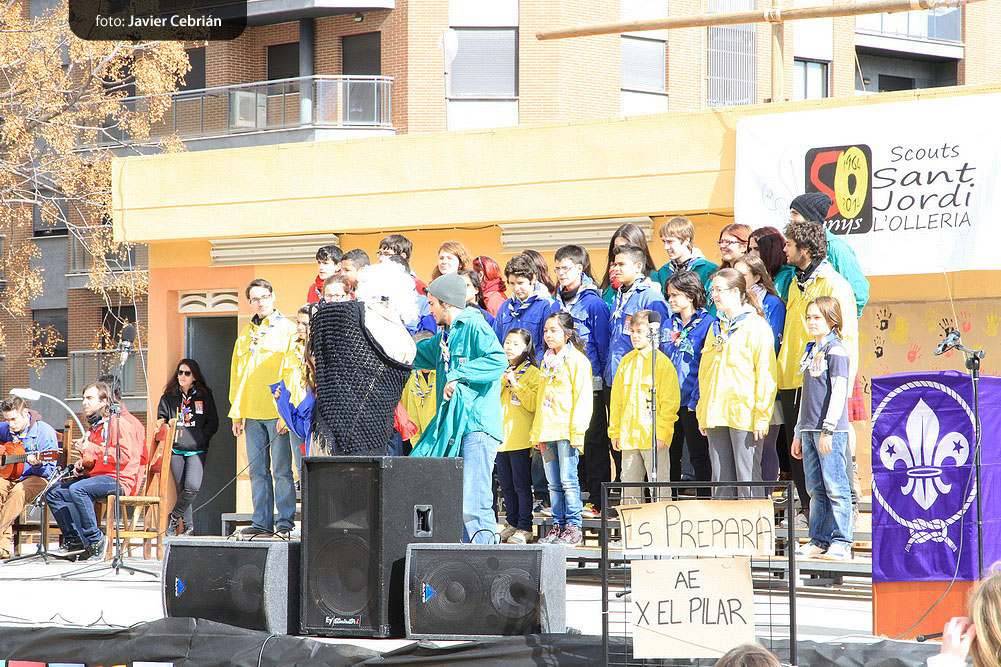 Estos fueron los acordes en los que cerraron el Grupo Scout Sant Jordi el XXX Festival de la Canción Scout celebrado en el Parque Beat Ferreres de l’Olleria, el pasado domingo 22 de febrero. Más de 2500 scouts venidos de todos los rincones de la provincia de Valencia y los que se quedaron en casa podían seguir el festival por el canal de Internet You Tube, gozaron este domingo de una de sus actividades más importantes del año a nivel asociativo, fueron 26 canciones llenas de sentimientos, escultismo, solidaridad, naturaleza… que hicieron que nuestro pueblo se llenara de notas musicales, un sin fin de notas de guitarra, ritmos de los bongós, voces celestiales de niños y niñas que consiguieron con sus canciones que las nubes y el frío de la mañana diera paso al flamante sol, un sol que nos acompañó buena parte de la mañana y que no se quiso perder ninguna de las actuaciones.