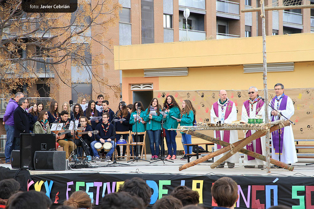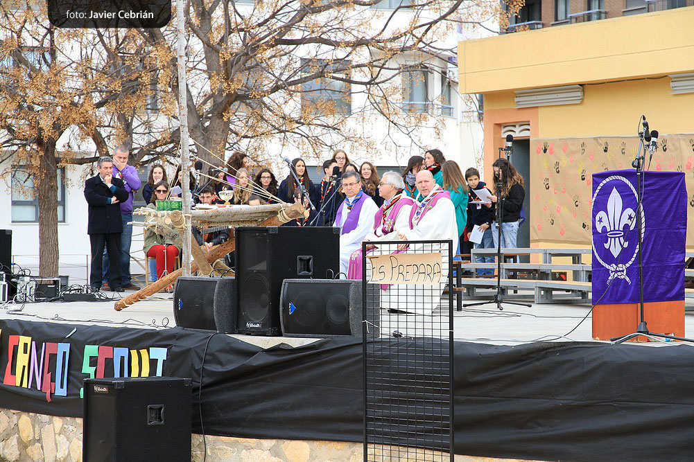 A las 10h del mañana empezamos con la eucaristía, la cual presidieron nuestro cura Don Emilio, Doro, que es el consiliario del Movimiento Scout de Valencia y de la Federación de Escultismo Valenciano y José Vicente Alberola cura de Catarroja y consiliario del mismo grupo, después de misa empezó el XXX Festival de la Canción, para romper el hielo el grupo Scout Sicània de Cullera presentaron la canción »Sueño» una bonita canción que nos sirvió para poder soñar en lo que iba a pasar, seguidamente fue el turno para el A.E. Orión de Valencia, que con sus 125 componentes llenaron el escenario de los colores del escultismo y nos guiaron en la canción por los »Cinc Camins», y así continuando hasta los 26 grupos, pasando por Valencia, Alaquàs, Massamagrell, Tabernas de Valldigna, Gandía, Xàtiva y muchos más pueblos de todas nuestras comarcas hasta llegar al nuestro Grupo que en la canción »50 anys fent camí» hicimos un repaso de nuestra historia y dejaremos abierto el camino para los futuros Scouts.