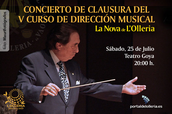 El próximo sábado 25 de julio en el Teatro Goya, se celebrará el concierto de clausura de V Curso de Dirección Musical, impartido por el Maestro Enrique García Asensio. Los alumnos del curso dirigiran la banda añadiendo los conocimientos adquiridos durante el curso. Resulta interesante comprobar como la misma banda sonorá diferente con cada director. Al finalizar el concierto se efectuará la entrega de los diplomas acreditativos.