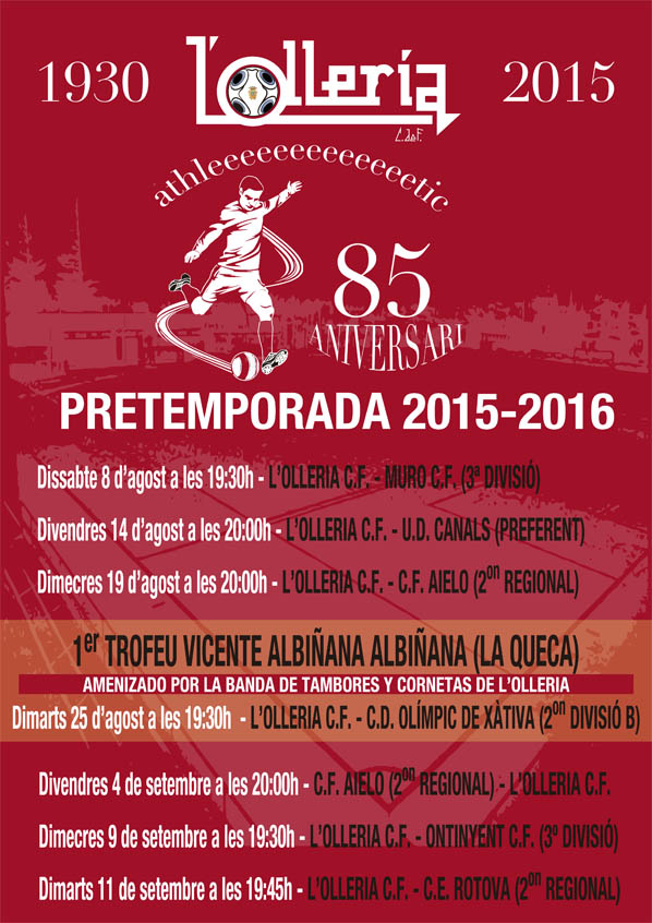 El pasado 30 de julio, l’Olleria CF, comenzó su pretemporada con una primera toma de contacto con los entrenamientos. En su 85º aniversario, el club ha preparado una pretemporada con equipos de potencial superior para poder conjuntar un plantilla que incorpora muchas caras nuevas, y renueva a otros con el fin de no pasar los apuros de la última temporada. Equipos de 3ª división como Muro CF y Ontinyent CF, de Preferente como la UD Canals y de 2ª Regional , CE Rotova y CF Aielo, componen unos atractivos enfrentamientos que tendrán su principal momento el 25 de agosto, con motivo del primer trofeo Vicente Albiñana (La Queca), donde los locales se mediran al CD Olímpic de Xátiva de 2ª División B. (ver fechas y orden de partidos al final de la noticia)