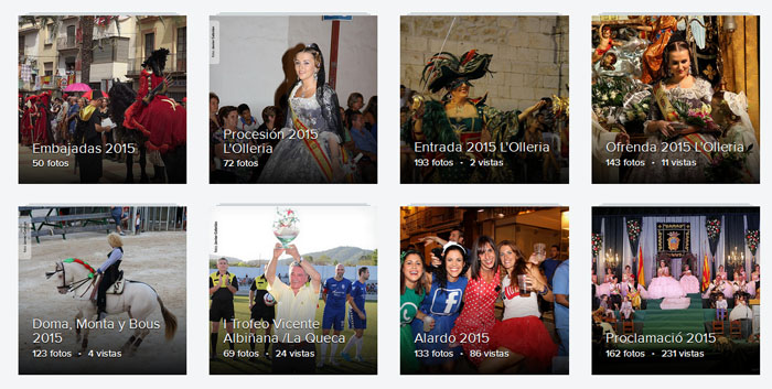 Mil fotos distribuidas en ocho albunes, de diferentes eventos que se han celebrado en las fiestas de l’Olleria. Agradecimientos a Javier Cebrián Cerdán autor de la mayoría de ellas (78%) , y a Eugénio Micó Sánchez, y Mª Nieves Sánchez, autores de una buena parte de las de la «entrada» y la «embajada mora» entre otras.