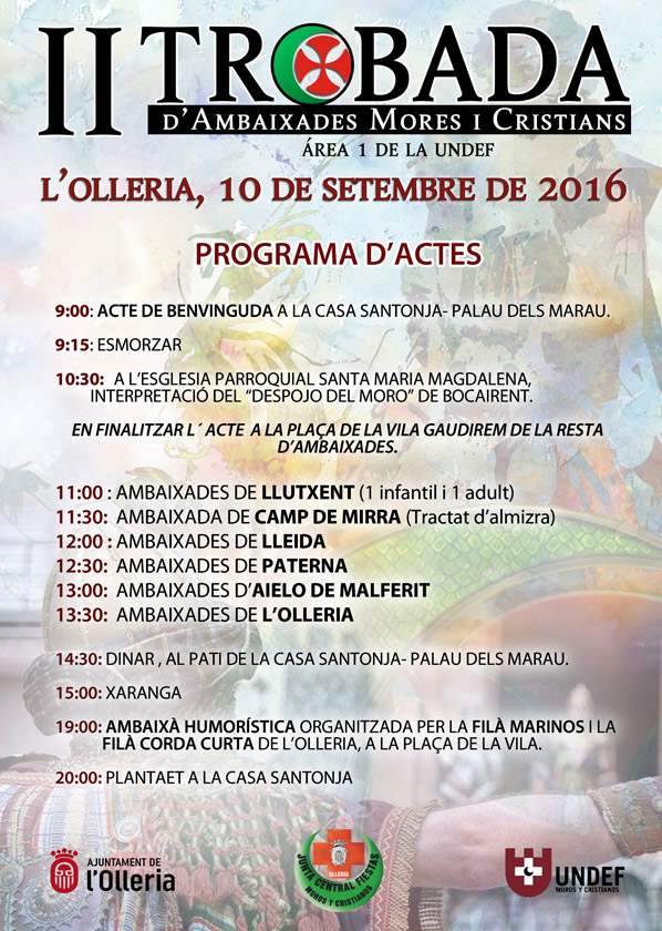 El próximo sábado día 10 se celebrará en l’Olleria la «II Trobada de Embaixades Mores i Cristians». El evento contará con formaciones de Llutxent, Camp de Mirra, Lleida, Paterna, Aielo de Malferit y l’Olleria.