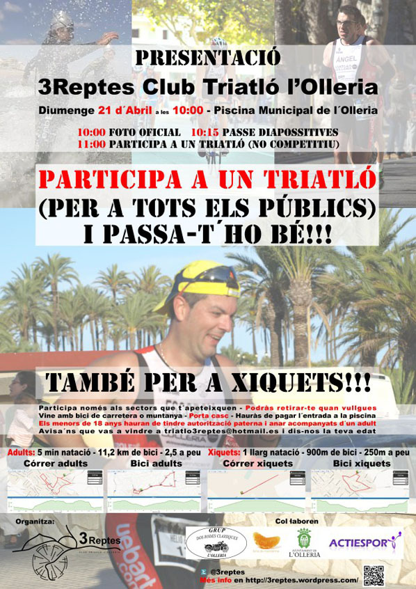 Este domingo 21 de abril, L’Olleria acoge un Triatlón no competitivo para todos los públicos, un evento deportivo organizado por Tres Reptes Club Triatló l’Olleria que se iniciará a las 10 de la mañana en la Piscina Municipal de la localidad.