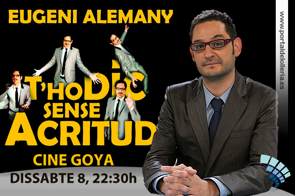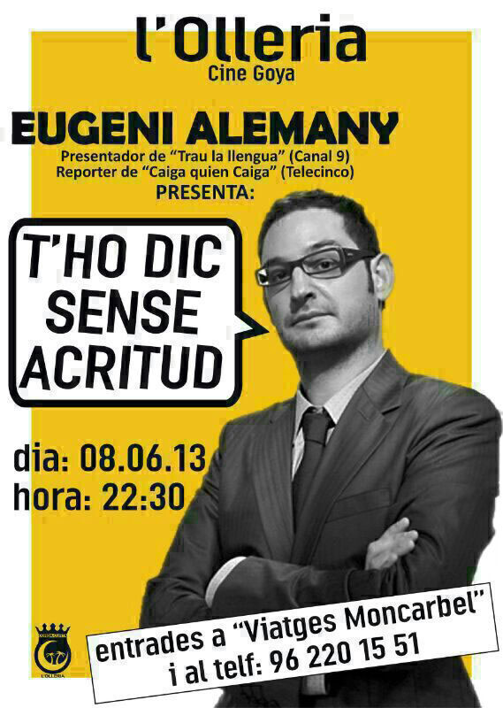 La Filà Corda Curta, presenta el monólogo «t’ho dic sense acrittut» a cargo del popular presentador Eugeni Alemany. La actuación será el próximo sábado, 8 a las 22:30h en el Teatro Goya. Las entradas se pueden adquirir en Viatges Moncarbel, ó en el telefono 96 220 15 51