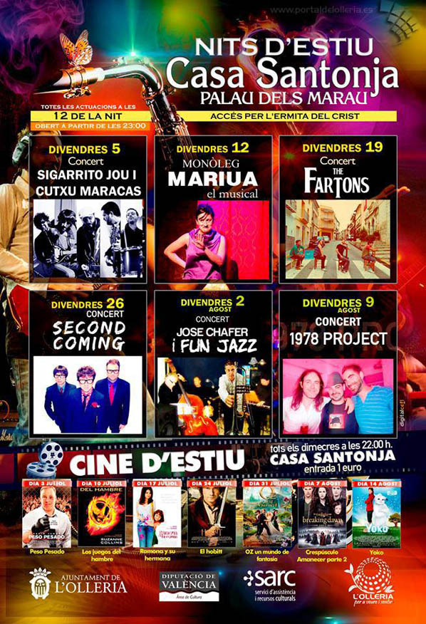 Las actuaciones, que se iniciarán a las doce de la noche, las abrirá el grupo musical de L’Olleria Sigarrito Jou i Cutxu Maracas, el viernes 12 el protagonista será el humor con el monólogo Mariua el musical, el 19 será el turno para el grupo local The Fartons, seguido el 26 por Second Coming, y ya en agosto el 2 el jazz será el protagonista con el músico local José Chafer y Fun Jazz cerrando la programación de este 2013 la música de 1978 Project.