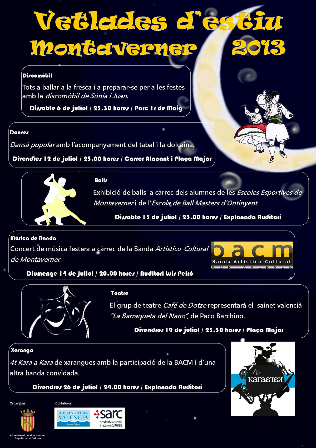 Montaverner estrenó las , «Vetlades d’Estiu», el pasado sábado, con una sesión de Discomóvil en el Parc 1ºde Maig, el resto de actuaciones hasta el 26 de Julio se pueden consultar en el cartel aparece a continuación.