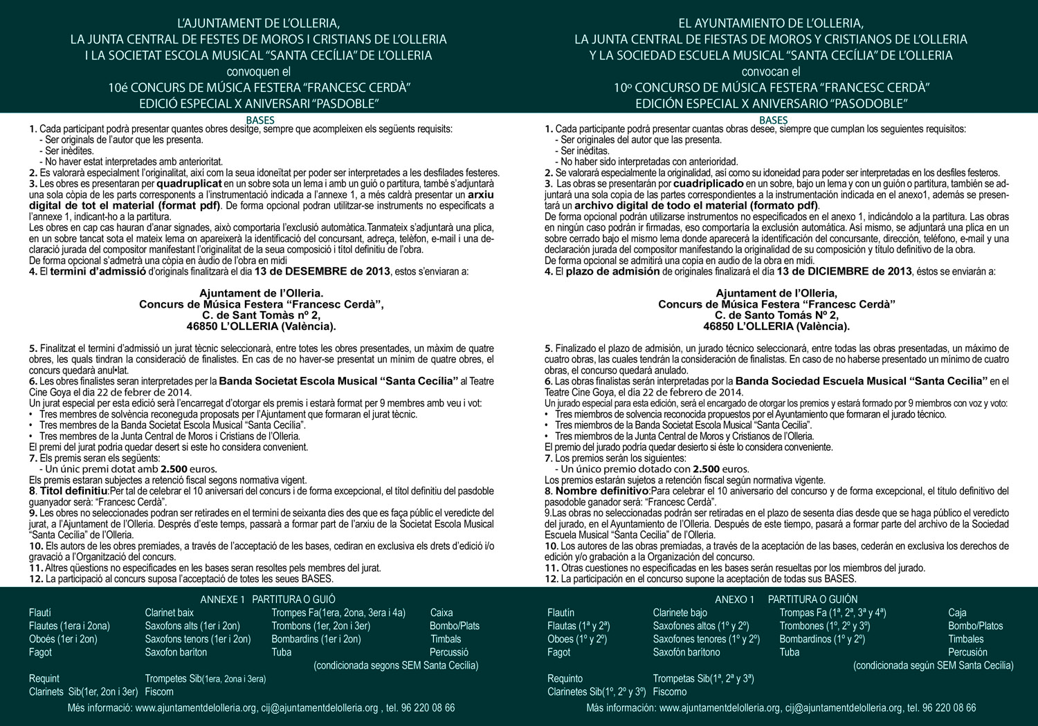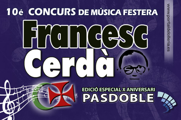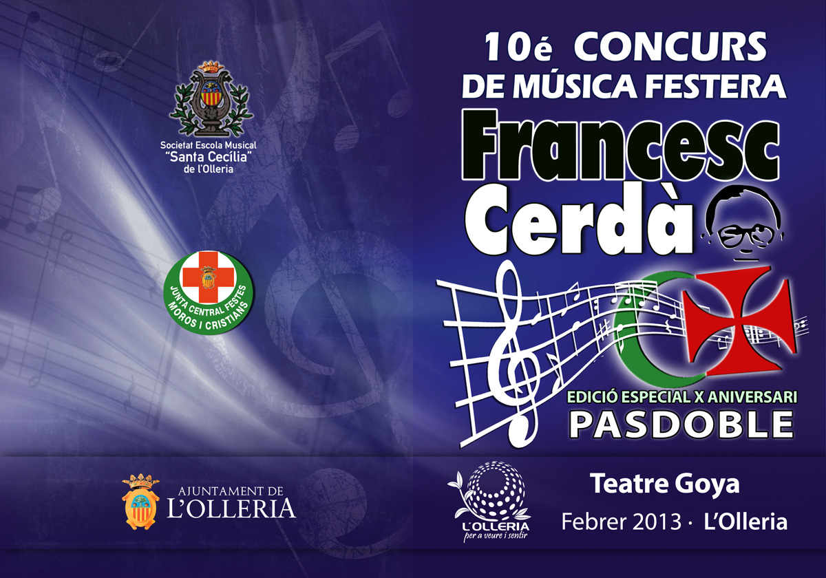 El Ayuntamiento de L’Olleria, La Junta Central de Fiestas de Moros y Cristianos de L’Olleria y la Sociedad Escuela Musical «Santa Cecília de L’Olleria, convocan el 10º Concurso de Música festera «Francesc Cerdà»  Edición Especial X Aniversario  «Pasodoble».