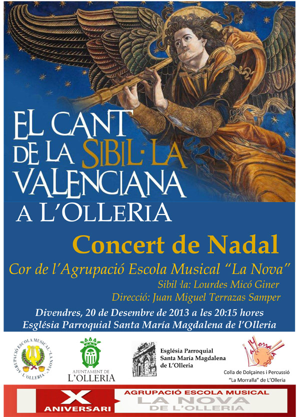 Este año, y dentro de las celebraciones del X . Aniversario de la AEM «La Nova » de l’Ollería , el concierto incluirá la interpretación del » Canto de la Sibil·la » valenciana. Este drama litúrgico y canto gregoriano , declarado Patrimonio Cultural Inmaterial de la Humanidad por la Unesco , se interpretaba en la misa del Gallo en las iglesias del sur de Europa . Desde el Concilio de Trento (1563 ) , que se prohibieron este tipo de manifestaciones en los templos , sólo se celebraba en Mallorca y Alguer. Desde 1948 se ha ido recuperando y interpretándose en muchas iglesias de Cataluña y de la Comunidad Valenciana , como Ontinyent , Gandia o Xeraco .