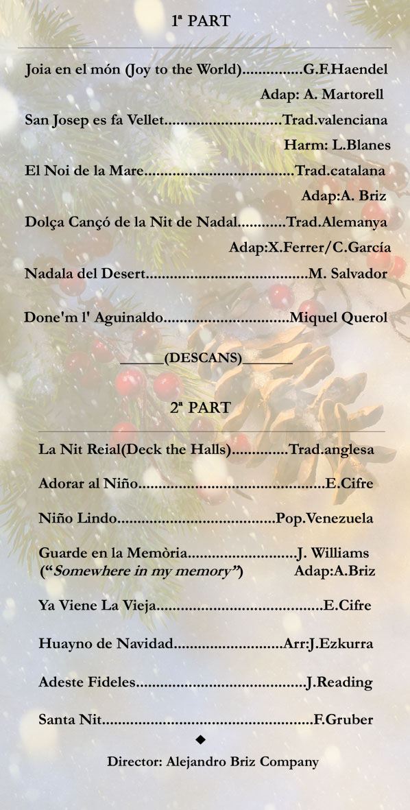 Concierto de Villancicos a cargo del Coro de la SEM Santa Cecília de L’Olleria. 22 de Diciembre a las 19:00h en la Iglesa Santa María Magdalena. Dirige Alejandro Briz Company.