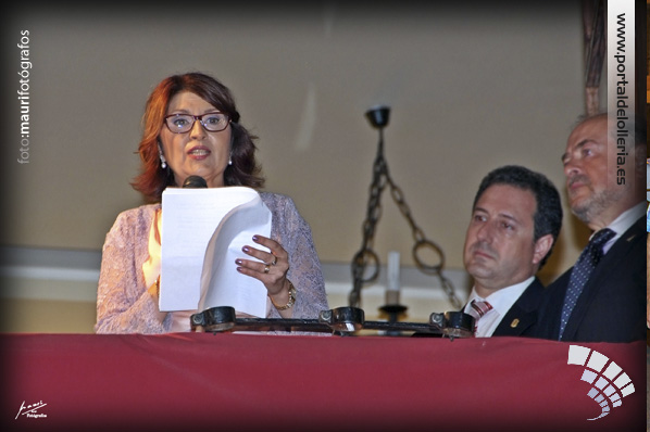 La publicadora de fiestas, persona destacada dentro del mundo festero de l’Olleria,  que además forma parte de una familia de amplia tradición festera,   quiso destacar en su intervención  el 60 aniversario que cumplen las filáes fundadoras de esta fiesta, que curiosamente, dos de ellas obstentan las capitanias de este año. Tanto Llevantins como Mariners celebran su 60 aniversario (junto con Chirigotes y Pirates son los fundadores de la fiesta de moros i cristians en l’Olleria, allá por 1954),  También en su intervención,  hizo referencias a los festeros fallecidos,  que durante el transcurso de las fiestas recibirán como todos los años su merecido homenaje.