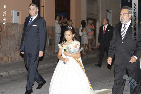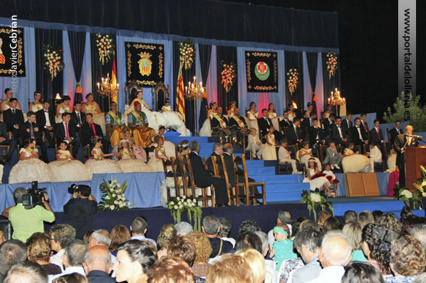 Las primeras palabras del Alcade, José Vidal, tras los saludos protocolarios, fueron para las reinas salientes, agradeciendoles, la dignidad y elegancia con que han representado a l’Olleria durante el año.  También hubo palabras de gratitud para Capitanes, Embajadores y festeros del año anterior por su buen trabajo en las fiestas anteriores.  En este año que se conmemora el 425º aniversario de l’Olleria, José Vidal destacó la fecha tan señalada como el 60 aniversario que celebran las capitanías, también quiso agradecer una vez más la hospitalidad el pueblo de L’Olleria en estos días en los que muchas de las personas que disfrutan de estas fiestas vienen de otros municipios.  También hizo mención a estos tiempos de crisis esperando que con la recuperación l’Olleria vuelva a recuperar poco a poco la ilusión y la capacidad de producir que teníamos hace pocos años, por último felicitó a las reinas de 2014, cortes de honor y festeros, así como a los cargos de fiestas, mantenedora y publicador a los que deseó unas fiestas inolvidables.