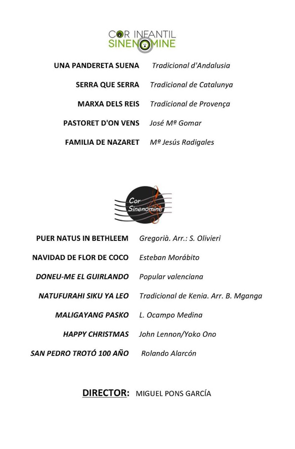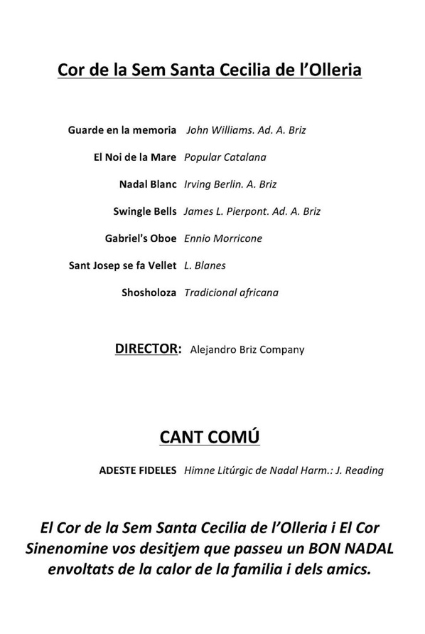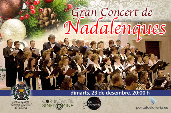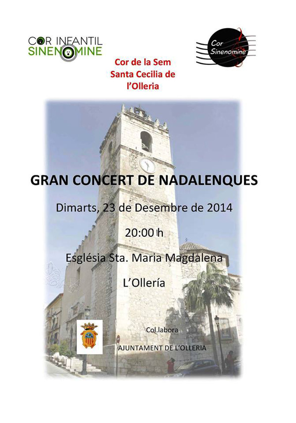 Este martes a partir de las 20:00 h. Se celebrará el Concierto Tradicional de Navidad, Además del Coro de la SEM Sta. Cecilia, actuarán los Coros infantil y Juvenil de Sinenómine de Benigánim. El acto tendrá lugar en la Iglesia Sta Maria Magdalena de l’Olleria.