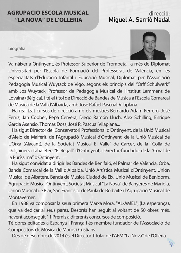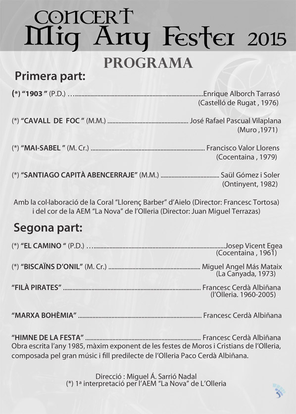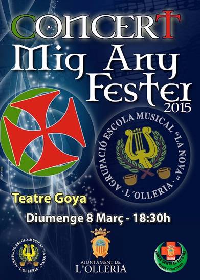 El domingo sobre las 18:30 h Concierto de música festera 2015 a cargo de AEM La Nova de L’Olleria. Se aprovechará el acto para la entre de premios del alardo de 2014 y escuadras y cabos escuadra de la Entrada 2014.