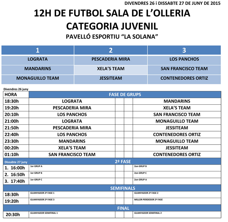 Esta tarde, a partir de las 18:30 h. comienzan las 12 horas de fútbol sala de categoría juvenil. 9 equipos distribuidos en tres grupos de los cuales se clasifican los dos primeros de cada grupo. El sábado a partir de las 16:00h, los clasificados jugaran en la modalidad de eliminatorias, los finalistas, disputaran la gloria a partir de las 20:30h.